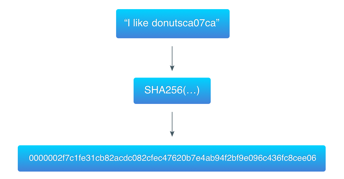 The first hash (calculated on “I like donuts”) is bigger than the target, thus it’s not a valid proof of work. The second hash (calculated on “I like donutsca07ca”) is smaller than the target, thus it’s a valid proof.