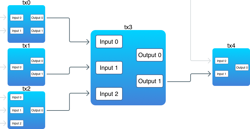 - In one transaction, inputs can reference outputs from multiple transactions.